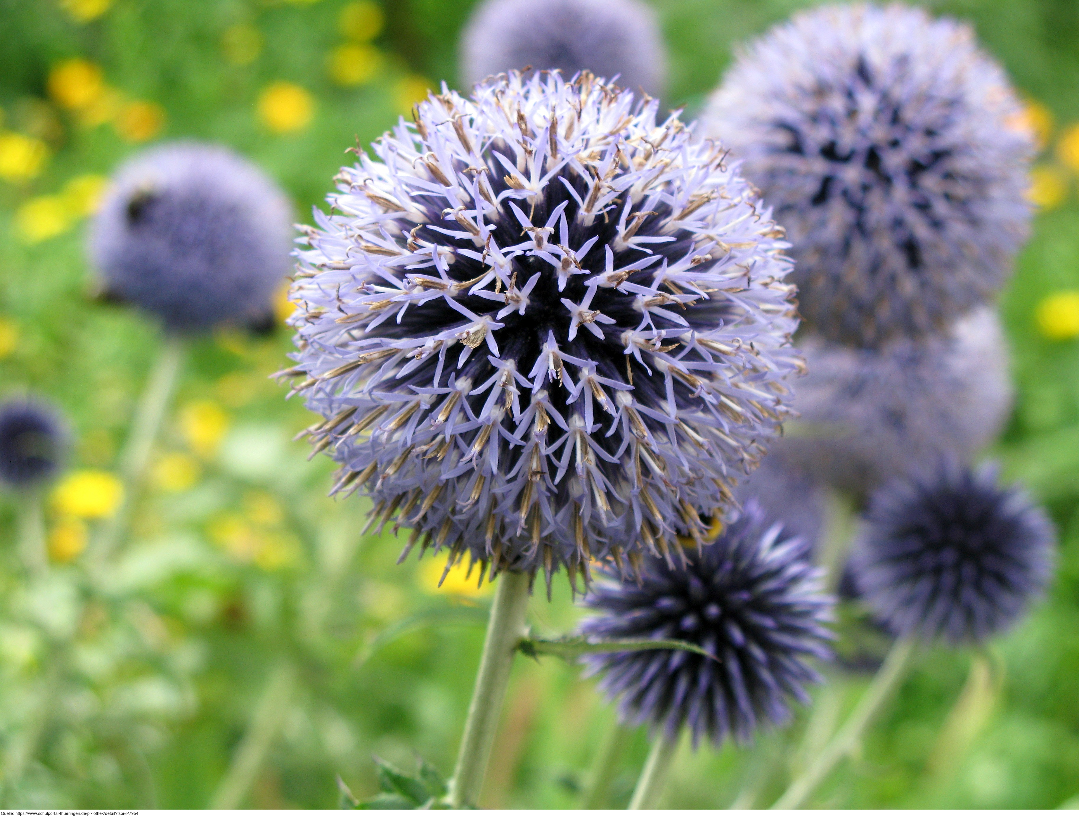 Das Foto gehört zur Serie Blumen im Garten. Es zeigt die Blüte einer Kugeldistel (Echinops ritro). Die Kugeldistel ist eine mehrjährige und anspruchslose Staude. Sie findet man in sonnigen Lagen und sie ist eine Bienenpflanze. Es gelten die Nutzungsbedingungen der Mediothek und Pixiothek.