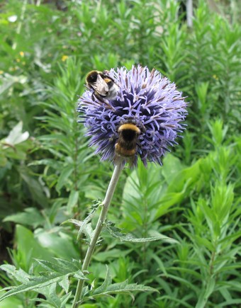 Das Foto gehört zur Serie Blumen im Garten. Es zeigt die Blüte einer Kugeldistel (Echinops ritro). Die Kugeldistel ist eine mehrjährige und anspruchslose Staude. Sie findet man in sonnigen Lagen und sie ist eine Bienenpflanze. Hier suchen Erdhummeln nach Nektar. Es gelten die Nutzungsbedingungen der Mediothek und Pixiothek.