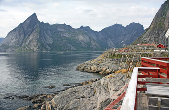 Das Foto gehört zur Serie "Lofoten". Es zeigt Trockengestelle für Stockfisch am Ufer. Es gelten die Nutzungsbedingungen der Mediothek und Pixiothek.