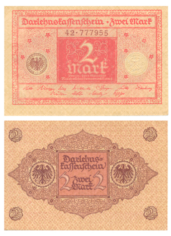 Das Foto gehört zur Serie "Zahlungsmittel in der Weimarer Republik (1918-1933)". Es zeigt einen Darlehenskassenschein über "Zwei Mark" der Reichsschuldenverwaltung Berlin vom 01. März 1920 . Es gelten die Nutzungsbedingungen der Mediothek und Pixiothek.