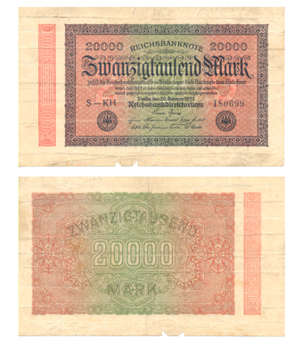 Das Foto gehört zur Serie "Zahlungsmittel in der Weimarer Republik (1918-1933)". Es zeigt eine Reichsbanknote über "Zwanzigtausend Mark" vom 20. Februar 1923. Es gelten die Nutzungsbedingungen der Mediothek und Pixiothek.