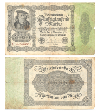 Das Foto gehört zur Serie "Zahlungsmittel in der Weimarer Republik (1918-1933)". Es zeigt eine Reichsbanknote über "Fünfzigtausend Mark" vom 19. November 1922. Es gelten die Nutzungsbedingungen der Mediothek und Pixiothek.