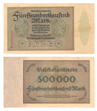 Das Foto gehört zur Serie "Zahlungsmittel in der Weimarer Republik (1918-1933)". Es zeigt eine Reichsbanknote über "Fünfhunderttausend Mark" vom 01. Mai 1923. Es gelten die Nutzungsbedingungen der Mediothek und Pixiothek.