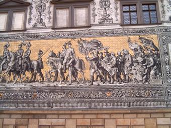 Das Foto gehört zur Serie "Dresdener Fürstenzug". Es zeigt den Abschnitt 1873 bis Jahrhundertwende - Albert, Georg, Bürgertum. Der Fürstenzug in Dresden ist das Bild eines Reiterzuges, aufgetragen auf rund 23.000 Fliesen aus Meißner Porzellan auf der Außenwand des Stallhofs in der Augustusstraße. Das 102 Meter lange Kunstwerk stellt die Ahnengalerie der zwischen 1127 und 1873 in Sachsen herrschenden Markgrafen, Herzöge, Kurfürsten und Könige aus dem Geschlecht des Fürstenhauses Wettin dar. Es gelten die Nutzungsbedingungen der Mediothek und Pixiothek.