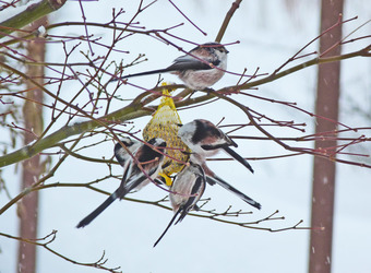 Das Foto gehört zur Serie "Vögel im Winter". Es zeigt Schwanzmeisen am Meisenknödel. Es gelten die Nutzungsbedingungen der Mediothek und Pixiothek.
