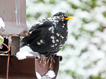 Das Foto gehört zur Serie "Vögel im Winter". Es zeigt ein Amselmännchen. Es gelten die Nutzungsbedingungen der Mediothek und Pixiothek.