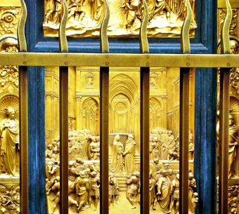 Das Foto gehört zur Serie "Paradiestür am Baptisterium von Florenz". Es zeigt die Begegnung Salomons und der Königin von Saba, ein Bronzerelief von Lorenzo Ghiberti. Es ist rechts in der untersten Reihe der zehn Bildtafeln in seine Paradiestür (auch Paradiespforte genannt) eingebunden. Es gelten die Nutzungsbedingungen der Mediothek und Pixiothek.