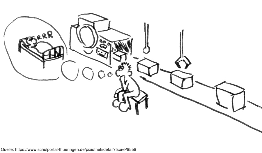 Das Foto gehört zur Serie "Paul". Es zeigt Paul in einer Arbeitspause am Fließband sitzen und sich nach Erholung sehnen. Das Bild ist unter CC0 lizenziert und kann somit frei verwendet werden.