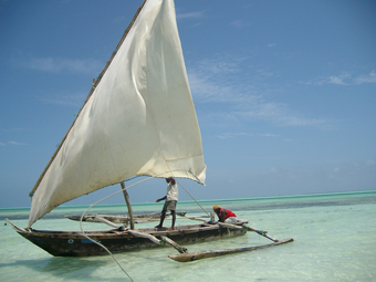 Das Bild zeigt ein Boot auf dem Victoriasee in Tansania.
