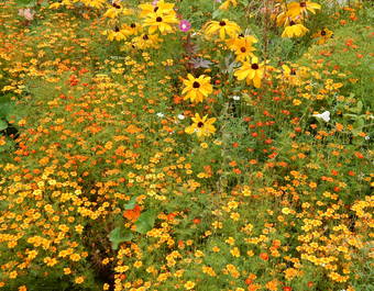 Das Foto gehört zur Serie "Blüten von Blumen". Es zeigt eine Fläche mit gelb-orangen Blütenpflanzen (Sonnenhut u. A.). Das Bild ist unter CC0 lizenziert und kann somit frei verwendet werden.