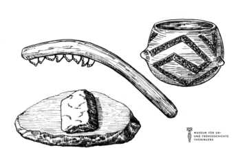 Das Bild gehört zur Serie "Zeichnungen Steinzeit - Museum für Ur- und Frühgeschichte Thüringens". Abgebildet sind Gegenstände der Pflanzer und Tierhalter. Es gelten die Nutzungsbedingungen der Mediothek und Pixiothek.
