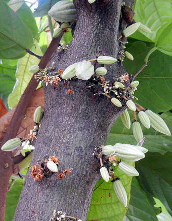 Das Foto gehört zur Serie "Kakao". Es zeigt geschlossene, geöffnete und verwelkte Blüten sowie sich entwickelnde Früchte am Stamm eines Kakaobaums. Das Bild ist unter CC0 lizenziert und kann somit frei verwendet werden.