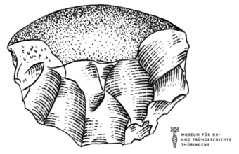 Das Bild gehört zur Serie "Zeichnungen Steinzeit - Museum für Ur- und Frühgeschichte Thüringens". Abgebildet ist ein Geröllwerkzeug als ein typisches Steinwerkzeug. Es gelten die Nutzungsbedingungen der Mediothek und Pixiothek.