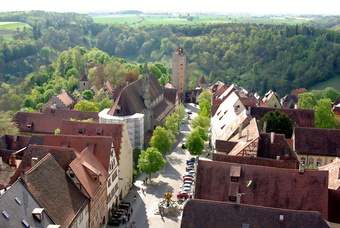 Das Foto zeigt einen Blick vom Turm auf einen Teil der mittelalterlichen Altstadt von Rothenburg ob der Tauber. Das Bild ist unter CC0 lizenziert und kann somit frei verwendet werden.