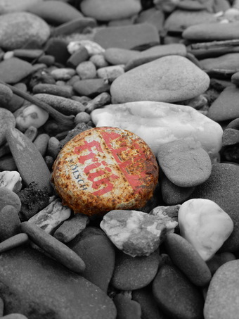 Das Bild gehört zur Serie "Strand". Es zeigt Steine am Flussufer mit verrostetem Kronkorken. Das Bild ist unter CC0 lizenziert und kann somit frei verwendet werden.