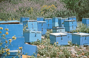 Das Foto gehört zur Serie "Insekten". Es zeigt blaue Magazinbeuten auf Kreta, die von Imkern als Behausung für ihre Bienenvölker eingesetzt werden. Das Bild ist unter CC0 lizenziert und kann somit frei verwendet werden.