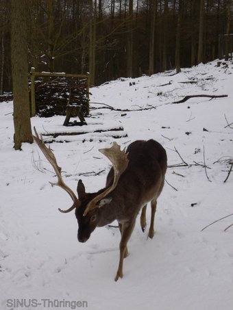 Abgebildet ist ein Damhirsch (Dama dama), jägersprachlich auch Damwild genannt. Die Tiere gehören zur Familie der Hirsche.
